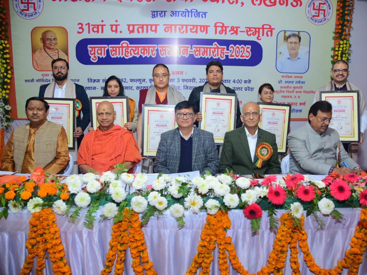 लखनऊ। राजधानी के निराला नगर स्थित माधव सभागार, सरस्वती कुंज में ‘भाऊराव देवरस सेवा न्यास’ द्वारा 31वें पं. प्रताप नारायण मिश्र स्मृति युवा साहित्यकार सम्मान समारोह का भव्य आयोजन किया गया। इस अवसर पर मुख्य अतिथि के रूप में उपस्थित परम पूज्य स्वामी गोविंद देव गिरि जी महाराज ने युवाओं को राष्ट्र निर्माण के लिए साहित्य सृजन की प्रेरणा दी। कार्यक्रम की अध्यक्षता ख्वाजा मोइनुद्दीन चिश्ती भाषा विश्वविद्यालय के कुलपति प्रो. अजय तनेजा ने की।